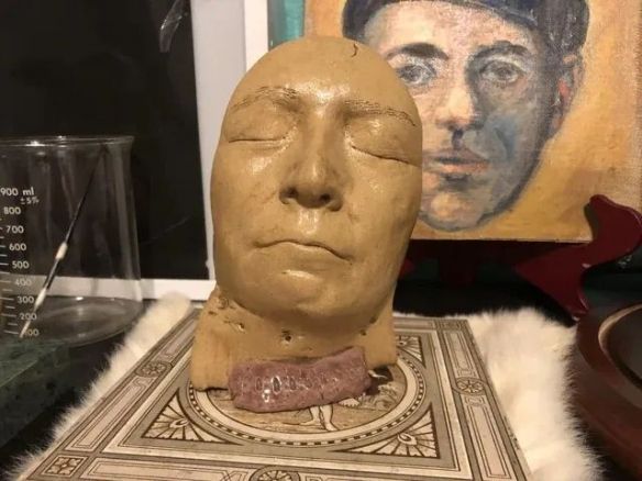 这是一个“死亡面具”,是用死人的脸塑造的,通常是通过从尸体上取模或印模制成的,在照相机诞生前比较常见,最著名的要属拿破仑的了